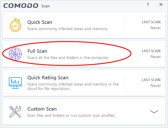 When you run a scan, you can choose from among three types: Quick scan, full scan, and custom scan.